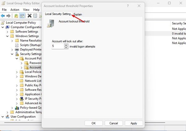 4。在帳戶鎖定閾值屬性上,切換到本地安全設置選項卡。