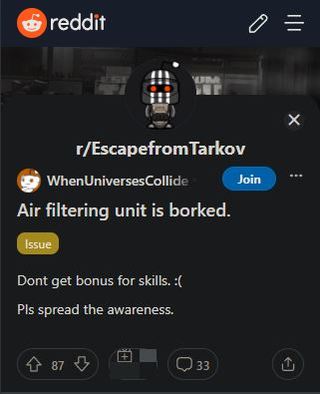Ein paar Wochen vorspulen, Escape from Tarkov-Spieler sagen jetzt (1,2 ,3,4,5), dass der Luftfilter verwanzt und nicht ausgeschaltet ist den Fertigkeitsbonus XP erhalten. Viele sagen, dass sie versucht haben, den Luftfilter sowohl offline als auch online zu testen, aber kein Modus bietet den XP-Boost.