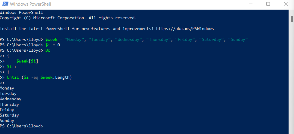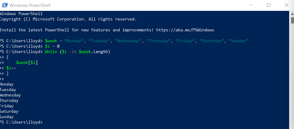 For ($i=0 ; $i-lt $week.Length ; $i++ )