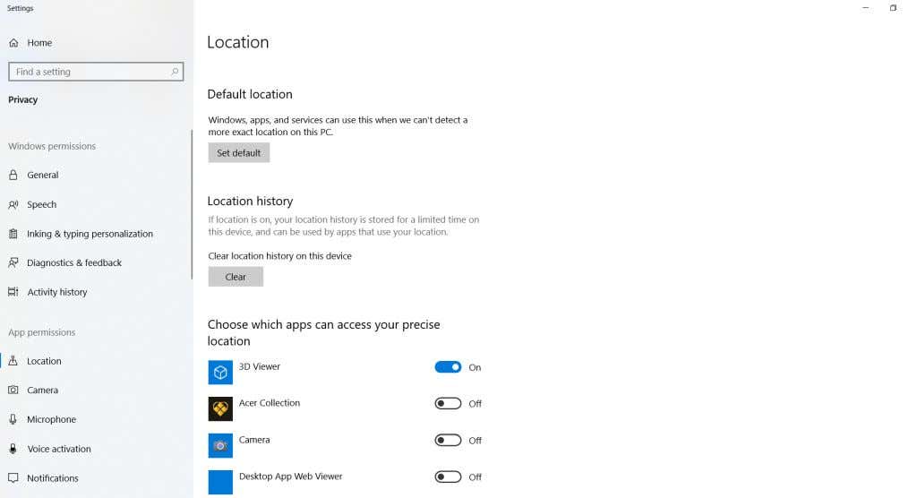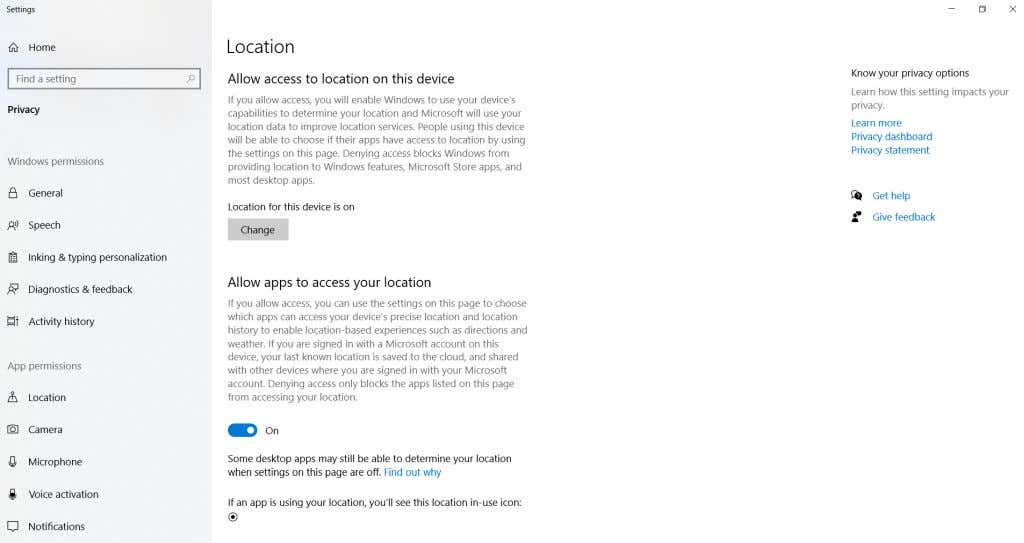 Wenn Sie nicht möchten, dass Windows-Apps Ihren Standort verfolgen, können Sie den Standortzugriff über Windows deaktivieren Einstellungen-App. Es gibt einige verschiedene Berechtigungseinstellungen, die Sie ändern können und die bestimmen, wie Ortungsdienste auf Ihrem PC verwendet werden. So gelangen Sie zu den Datenschutzeinstellungen für den Standort.