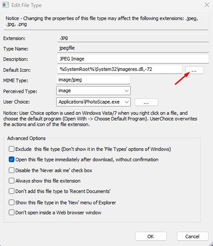 6. Klicken Sie im Fenster Dateityp bearbeiten auf die Schaltfläche neben dem Feld Standardsymbol.