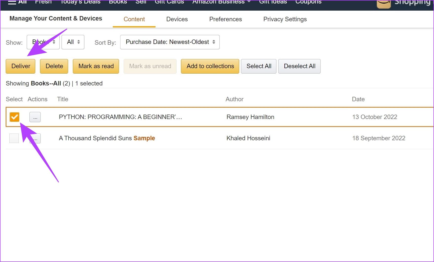 Die obigen Methoden funktionieren, wenn Sie lokale Dateien und Dokumente an Kindle senden. Wenn Sie jedoch nur gekaufte Bücher an Ihren Kindle-Reader senden müssen, können Sie dies auch über die Amazon-Website tun.