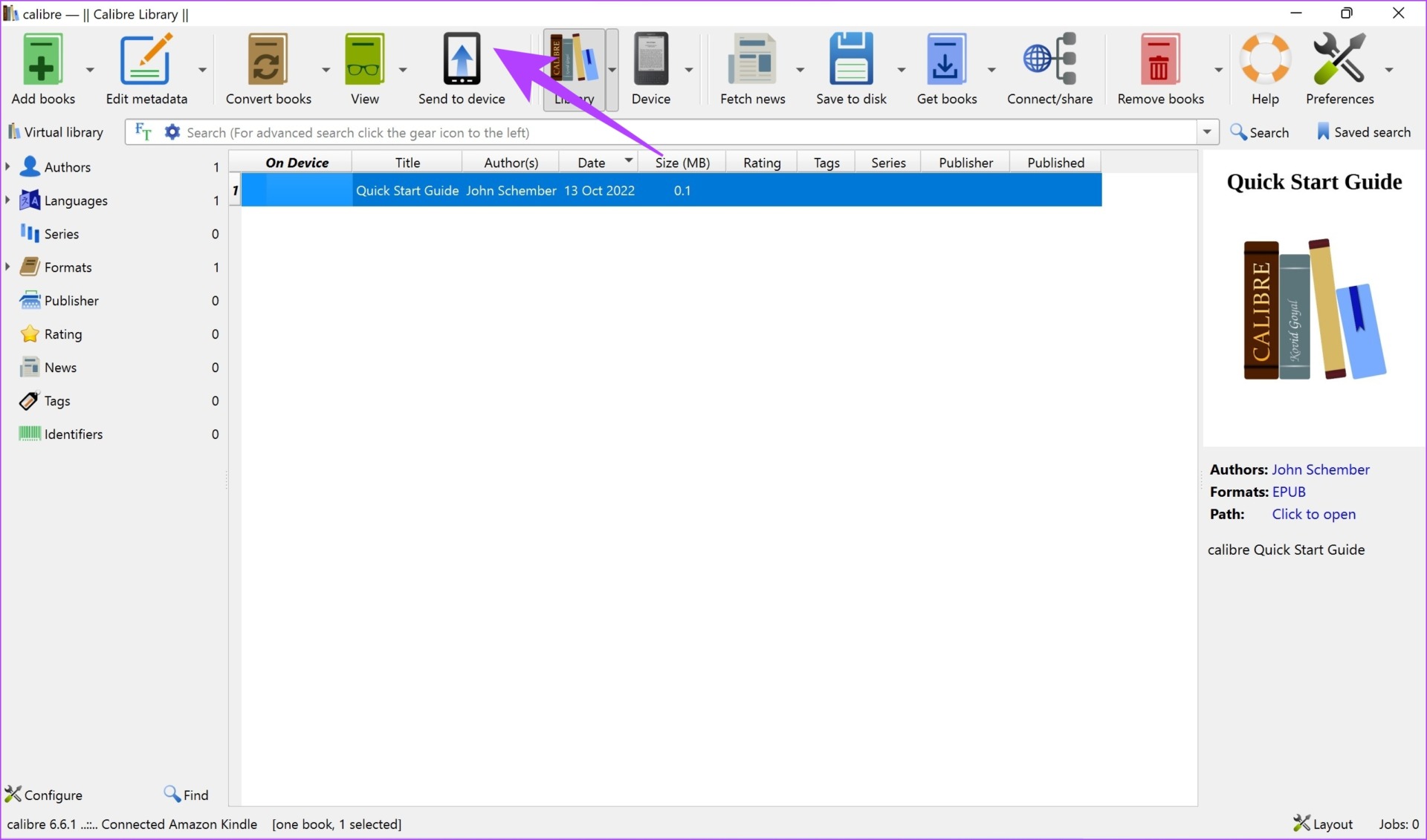 Schritt 5: Wählen Sie das Dokument in Calibre aus und klicken Sie in der Symbolleiste auf „An Gerät senden“.