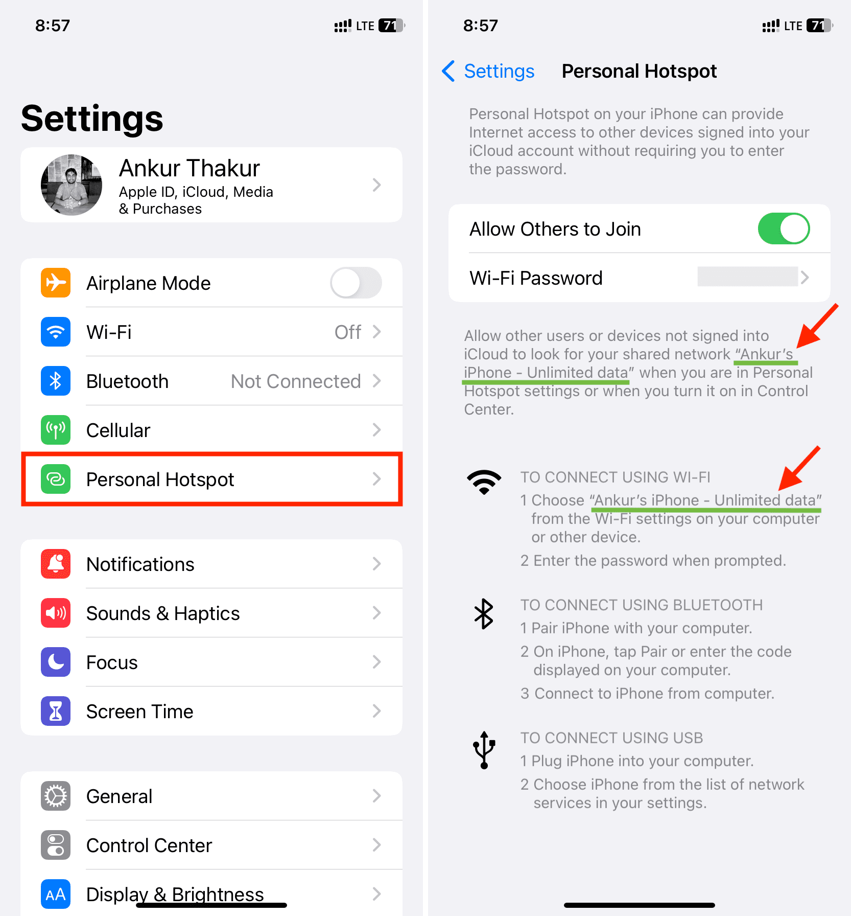 Sie können dies überprüfen, indem Sie zu iPhone Einstellungen > Persönlicher Hotspot gehen. Wenn Sie die Option nicht sehen, gehen Sie zu Einstellungen > Mobilfunk (oder Mobile Daten) > Persönlicher Hotspot. Hier sehen Sie Ihren geänderten Hotspot-Namen. Dieser Name wird jetzt auf anderen Geräten angezeigt, wenn der Schalter für Anderen den Beitritt erlauben aktiviert ist.