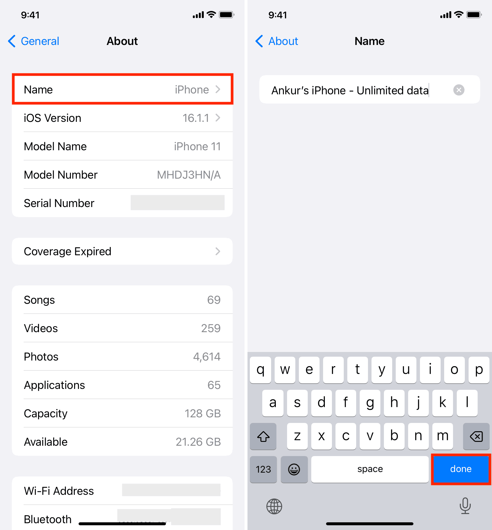 Öffnen Sie die Einstellung. strong>-App und tippen Sie auf Allgemein. Tippen Sie auf Info und tippen Sie auf das Feld Name. Geben Sie den neuen Namen ein und tippen Sie auf der Tastatur auf die Schaltfläche Fertig.