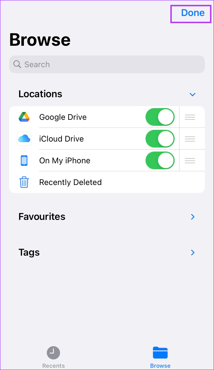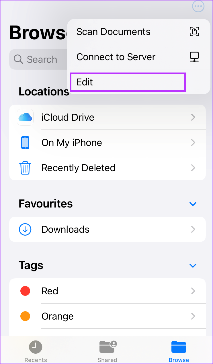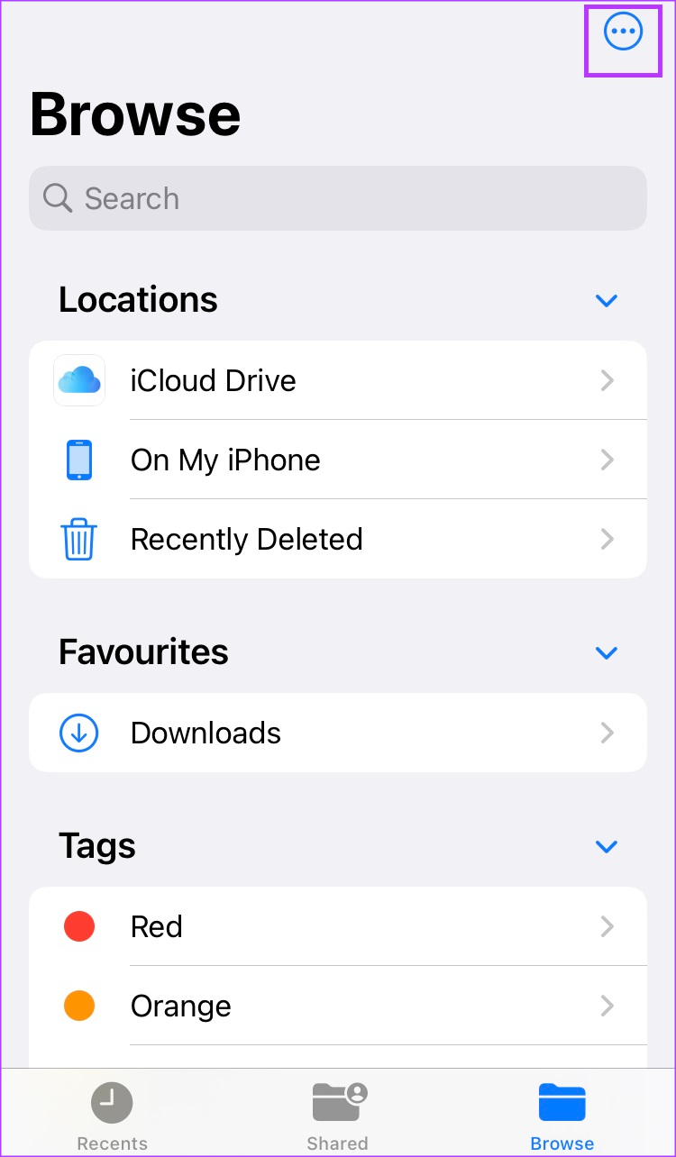 Schritt 3: Auf der Durchsuchen-Bildschirm sehen Sie alle Ihre Speicherorte. Tippen Sie oben rechts auf das Symbol mit den drei Punkten.