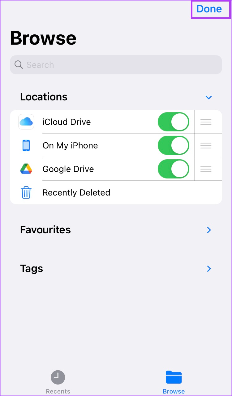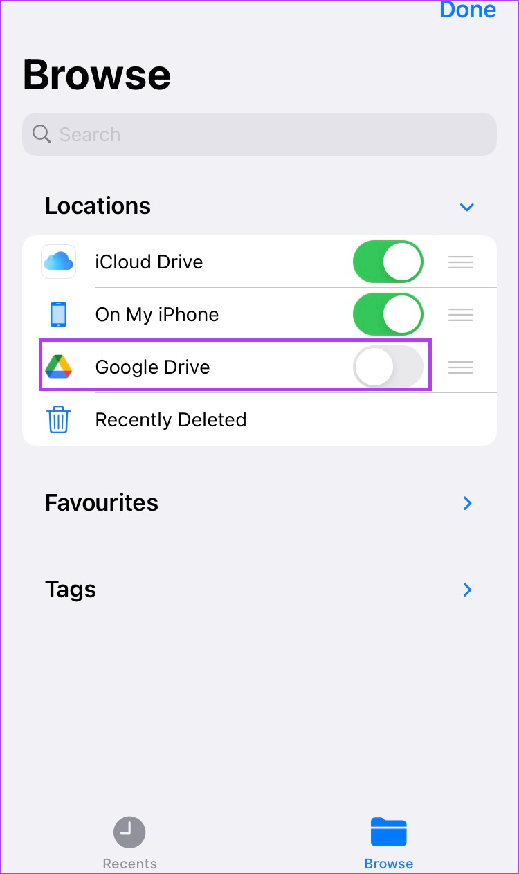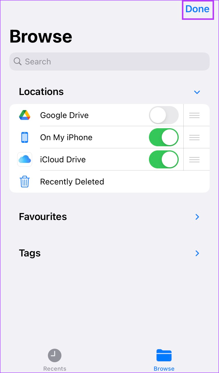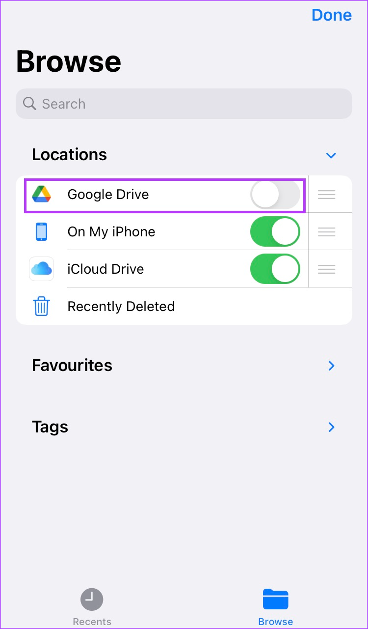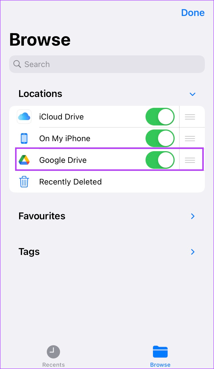 Schritt 5: Auf dem Bearbeitungsbildschirm werden neben jedem Speicherort Schalter angezeigt. Deaktivieren Sie den Schalter neben Google Drive und stellen Sie sicher, dass es eine graue/weiße Füllung hat (abhängig von Ihrem iPhone-Design).