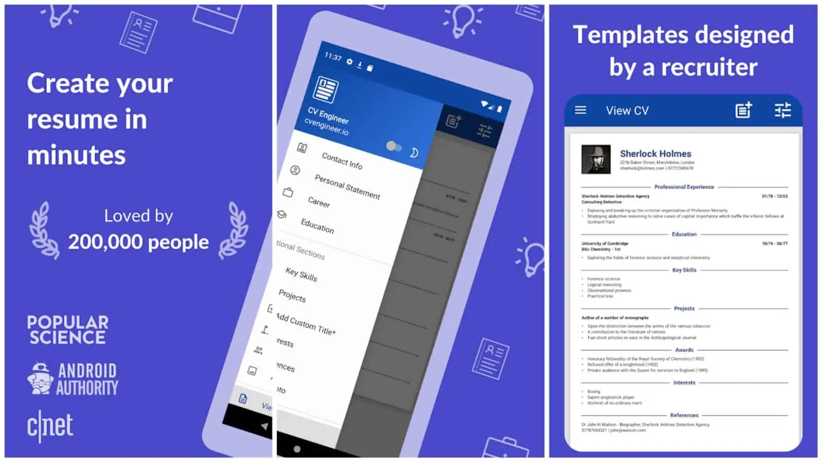 Diese App führt Sie Schritt für Schritt auf Ihrem Weg zu einem großartigen Lebenslauf. Es wird sich anfühlen, als würde man ein normales Formular ausfüllen. Sie müssen Ihre Fähigkeiten, Interessen, Ausbildung usw. auflisten. Sobald Sie fertig sind, können Sie Ihren Lebenslauf speichern und ihn dann an Ihren möglichen Arbeitgeber senden. Sie können es direkt in Ihrem Google Drive-Konto speichern, wenn Sie fertig sind, oder es sogar direkt per E-Mail teilen, es liegt an Ihnen.