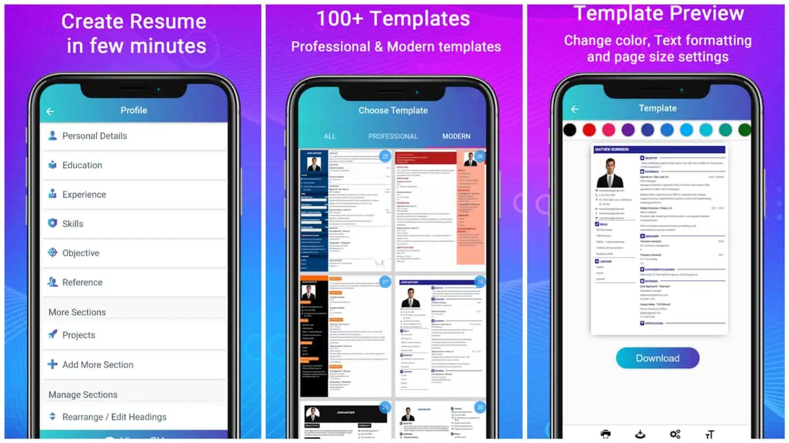 Mit der App können Sie die Einstellungen für Farbe, Textformatierung und Seitengröße für die angebotenen Vorlagen ändern. Außerdem werden Sie bei jedem Schritt von der App angeleitet, was das Erstellen eines Lebenslaufs noch einfacher macht. Optionen zur Formatierung des Lebenslaufs sind ebenfalls enthalten, und sobald Sie mit der Zusammenstellung Ihres Lebenslaufs fertig sind, können Sie ihn im PDF-Format herunterladen. Auf diese Weise ist es extrem einfach, es zu teilen.