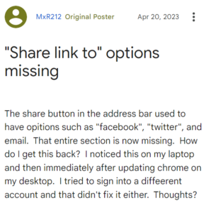 Einige Google Chrome-Benutzer haben jetzt gemeldet, dass das letzte Update des Webbrowsers die Optionen zum Teilen zum Linken entfernt hat.