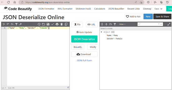 Auf diese Weise können Sie JSON jetzt einfach und kostenlos online deserialisieren. Meistens wird Code in verschiedenen Programmiersprachen geschrieben. Aber Code Beautify ist das einzige kostenlose Online-Tool, mit dem Sie dies ohne Codierung tun können.