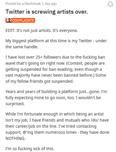 Einige Twitter-Nutzer (hauptsächlich Künstler) haben sich inzwischen darüber beschwert, dass die Plattform ihre Konten wahllos sperrt oder sperrt (1,2,3,4,5).