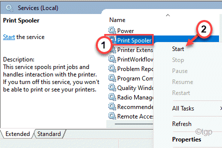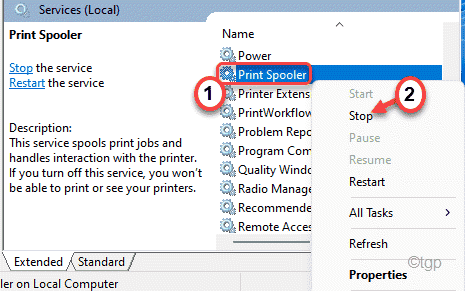 4. Klicken Sie hier mit der rechten Maustaste auf den Dienst”Druckspooler“und tippen Sie auf”Stop“, um den Dienst zu beenden.