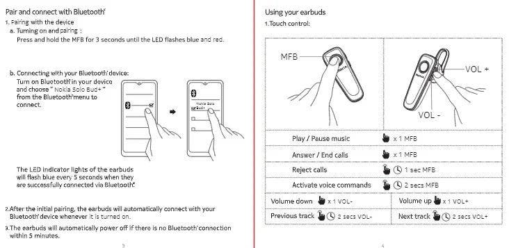 Die Bedienungsanleitung zeigt, dass die Multifunktionstaste zur Steuerung der Musikwiedergabe dient. Es bietet Optionen wie Pause und Wiedergabe während der Musikwiedergabe. Sie können es aber auch zum Annehmen, Beenden und Abweisen von Anrufen verwenden. Die Lautstärketasten können auch zum Umschalten zwischen den Tracks verwendet werden. Alle diese Funktionen funktionieren basierend darauf, wie lange Sie die besagte Taste drücken. Wir wissen es nicht, aber einige Unternehmen neigen dazu, Begleitanwendungen bereitzustellen, mit denen Benutzer diesen Tastendrücken benutzerdefinierte Funktionen zuweisen können. Wir wissen nicht, ob dies beim Nokia Solo Bud+ der Fall sein wird.
