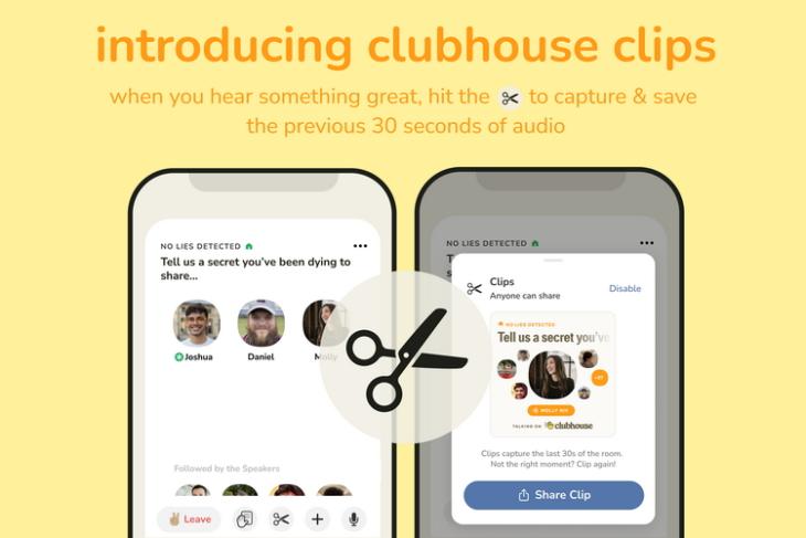 Eine weitere Funktion im Clubhouse sind Clips. Mit Clips kann jeder 30-Sekunden-Clips von öffentlichen Räumen mit anderen Apps teilen oder sogar in der Galerie speichern. Nach Angaben des Unternehmens können Sie Clips aktivieren, wenn Sie den Raum starten. Es ist erwähnenswert, dass Clips standardmäßig für offene oder öffentliche Räume aktiviert ist, aber deaktiviert werden kann. Die Funktion ist in privaten, sozialen oder Clubräumen nicht verfügbar. Sie können auf das Scherensymbol drücken, um einen Clip der letzten 30 Sekunden zu speichern. Clips ist als Beta für eine kleine Gruppe von Entwicklern verfügbar.