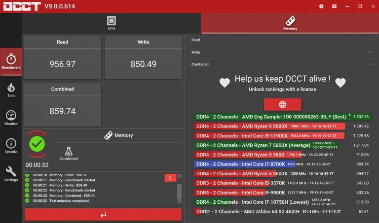 La última versión de OCCT 9 ahora tiene una nueva pestaña que ofrece un punto de referencia muy fácil de usar y relativamente corto para procesadores y memoria. El punto de referencia de la CPU proporciona cuatro métricas, incluidos los resultados de un solo subproceso y de varios subprocesos para las instrucciones SSE y AVX, respectivamente. Según el autor, el punto clave de la nueva función de evaluación comparativa es informar sobre toda la información del sistema y los datos de los sensores de hardware que se cargan en la página de resultados.