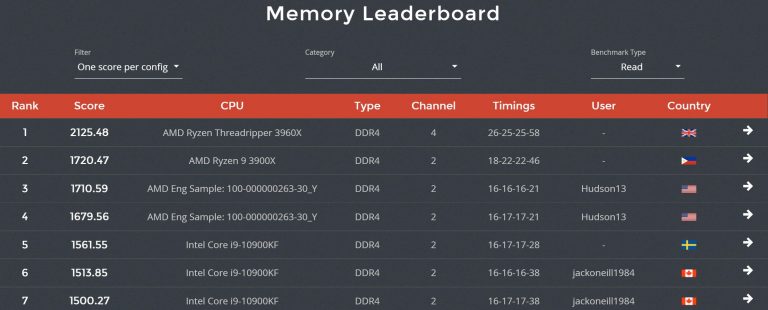El benchmark ofrece tablas de clasificación de CPU y memoria, actualmente ocupadas principalmente por AMD Ryzen Threadripper Procesador 3960X o sistemas equipados con CPU Intel Core i9-10900KF.