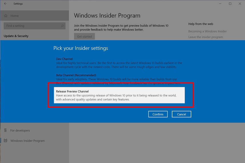 Elija el”Canal de vista previa de la versión”para obtener la actualización.