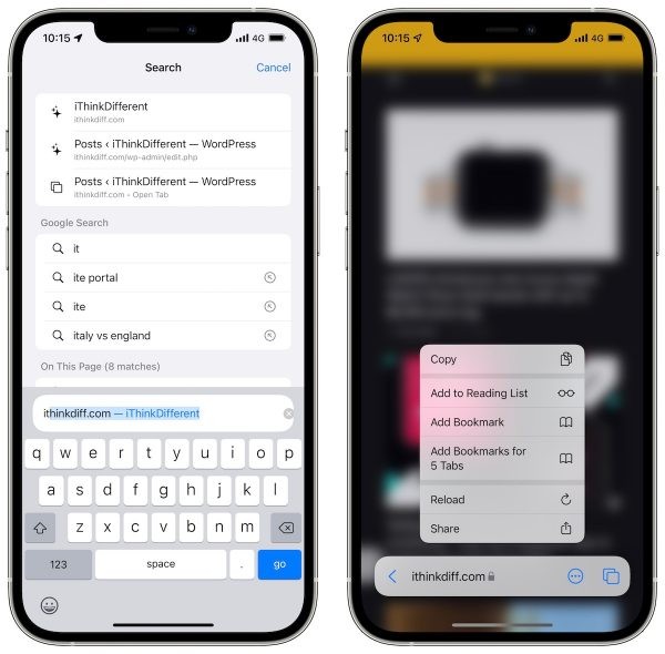Safari ahora cuenta con una barra de direcciones que se adhiere a la parte superior del teclado cuando se toca. Cuando comienzas a escribir, hay una nueva interfaz que muestra sugerencias del historial, búsqueda web y de la página web abierta actualmente. Si mantiene presionada la barra de direcciones, ahora verá la opción de actualización. Sin embargo, la opción de compartir todavía está oculta detrás del menú.