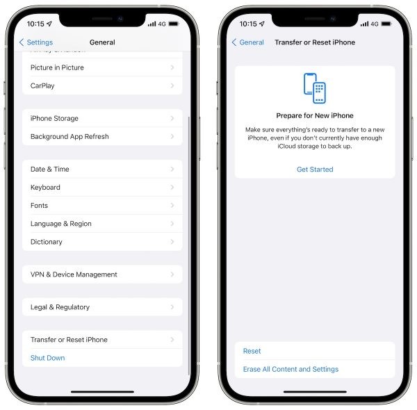 Apple ha realizado algunos cambios importantes en las opciones de reinicio del iPhone. Se le cambió el nombre a”Transferir o restablecer iPhone”. Una nueva característica que está al frente y al centro, permite a los usuarios prepararse para la migración a un nuevo iPhone, mientras que en la parte inferior de la pantalla, los usuarios pueden acceder a las opciones de restablecimiento de la configuración de red, etc., así como a la opción de restablecer todo el contenido y la configuración.