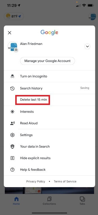 Con la aplicación de búsqueda de Google para iOS, puede eliminar rápidamente 15 minutos de su historial de búsqueda