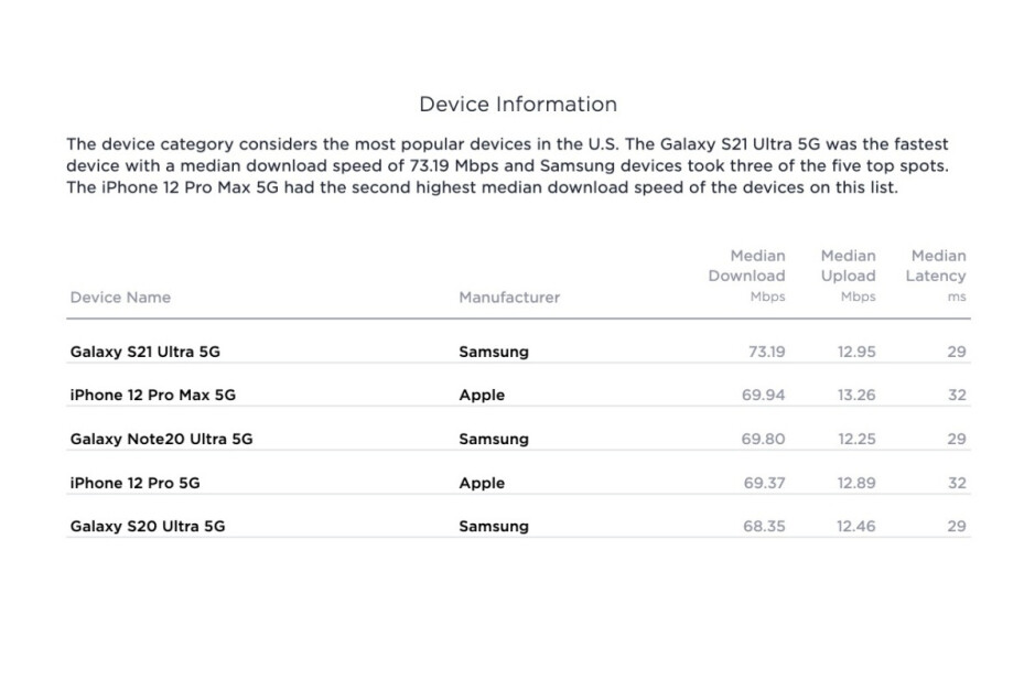 Si usted recuerde informe trimestral anterior de Ookla , probablemente también recuerde la sorprendente conclusión de la compañía con respecto a la más rápida de las”más populares dispositivos en los EE. UU.”No sabemos exactamente qué sucedió en los últimos tres meses, pero Galaxy S21 Ultra 5G (como era de esperar) lidera el último gráfico, por delante del objetivo iPhone 12 Pro Max 5G . El Galaxy Note 20 Ultra 5G un poco más antiguo sigue en tercer lugar, muy por detrás del medallista de plata antes mencionado y menos de medio megabit por segundo por delante del iPhone 12 Pro 5G en velocidades de descarga medias.