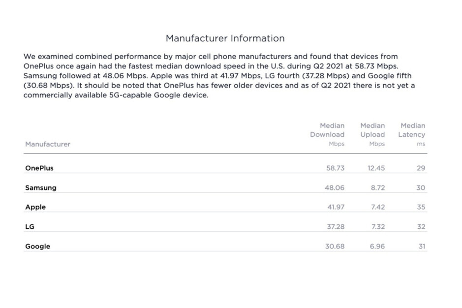 Dicho esto, OnePlus sigue siendo el fabricante de dispositivos móviles número uno en velocidades de descarga y carga en EE. UU., superando cómodamente a Samsung, Apple, LG y Google al… vender mucho menos modelos antiguos y sin 5G.