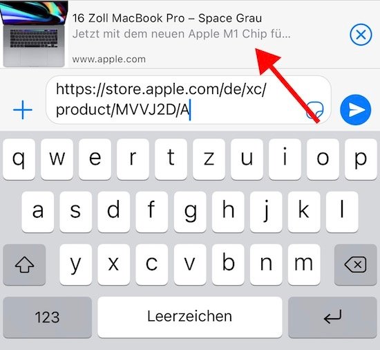 Apple Messages resuelve enlaces para que los destinatarios puedan ver una vista previa de lo que se les envía. Y en este caso, la vista previa incluía las palabras, en alemán,”Ahora con el nuevo chip Apple M1…”.