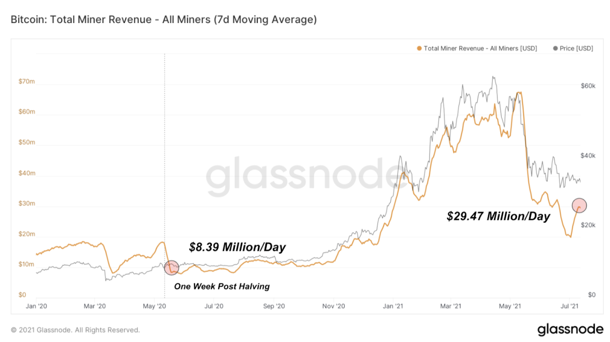 Una semana después del evento de reducción a la mitad, el promedio móvil de siete días de los ingresos de los mineros fue de solo $ 8.39 millones por día, y actualmente, a niveles muy similares de tasa de hash y dificultad, los mineros han ganado $ 29.47 millones por día en promedio durante el la semana pasada.