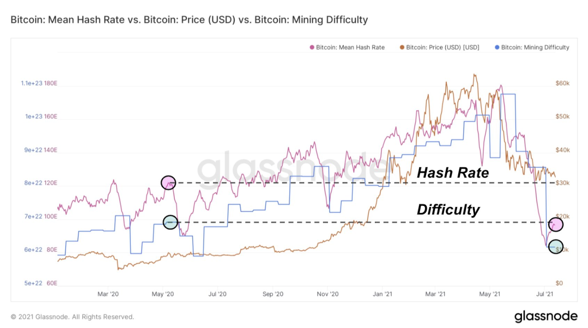 Con la caída en la tasa de hash, tanto la dificultad de minería como la tasa de hash (promedio móvil de siete días) son más bajas que en el momento de la reducción a la mitad de bitcoin, cuando el precio de bitcoin era de $ 8,800.
