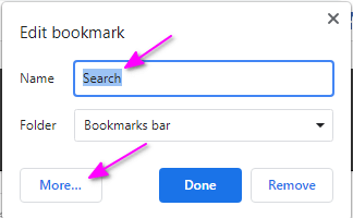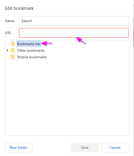 3. Nómbrelo”Buscar”(o cualquier otro nombre que desee) como se muestra en la imagen de arriba. Tenga en cuenta que mantener el nombre corto significa que ocupará un espacio menos valioso en la barra de marcadores.