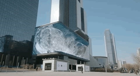 El primer gran revuelo que hizo esta dinámica fue en realidad en Seúl , Corea del Sur, el vecino occidental de Japón, el año pasado a través de una pantalla adecuada llamada ed WAVE con una serie continua de ondas virtuales que parecen chocar contra el contenedor de vidrio de la valla publicitaria.