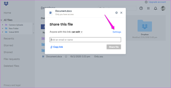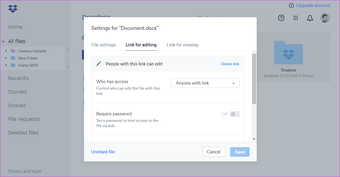 Si desea otorgar acceso a un archivo o carpeta a alguien, pero no lo haga desea que él/ella haga cambios o edite el archivo, comparta un enlace al archivo o lo invite por correo electrónico con la opción’puede ver’seleccionada. Establezca una contraseña para que solo aquellos que tengan la contraseña puedan acceder al archivo. Y finalmente, establezca una fecha después de la cual el enlace caducará si desea establecer un enlace para compartir y olvidarlo.