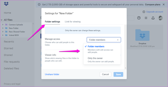 Paso 4: ahora, cuando regrese al menú Compartir de la carpeta, puede elegir quién puede agregar nuevos miembros a la carpeta compartida en Configuración> Configuración de carpeta. Solo el propietario o alguien que se haya agregado a la carpeta.