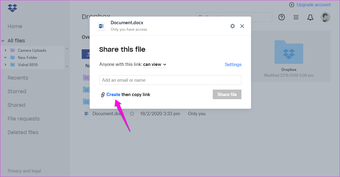 Paso 5: finalmente, en lugar de ingresar una ID de correo electrónico para enviar una invitación, también tiene la opción de compartir un enlace al archivo a través de aplicaciones de mensajería social. Haga clic en la opción’Crear y luego copiar enlace’para hacerlo.