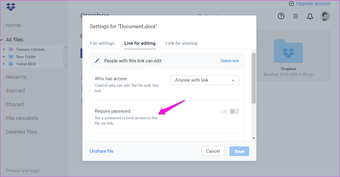 Paso 8: Si ha creado un enlace para compartir con permisos de edición, haga clic en la pestaña Enlace para editar, donde encontrará permisos adicionales. Puede establecer una contraseña para proteger aún más el archivo de accesos y ediciones no autorizados.