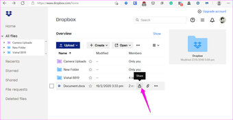 Paso 1: Puedes: cree una carpeta sin conexión en su computadora y agréguela a Dropbox o cree una directamente dentro. Dropbox también te permite crear una carpeta compartida directamente. Haga clic en el botón Crear para encontrar esa opción.