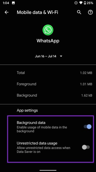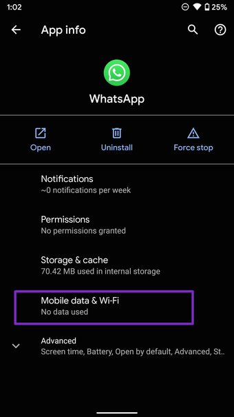 Si ha inhabilitado el uso de datos en segundo plano para WhatsApp, el servicio no se ejecutará en segundo plano. WhatsApp intentará comprobar las notificaciones más recientes, pero no las entregará porque no tiene acceso a Internet mientras se ejecuta en segundo plano. Debe eliminar dicho límite del menú Configuración.