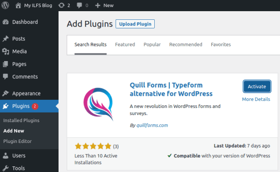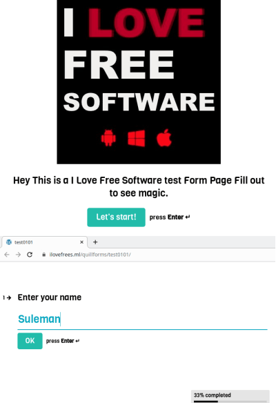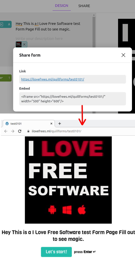 Quill Forms es una alternativa gratuita de Typeform para WordPress . Puede usarlo para crear encuestas y cuestionarios directamente desde su sitio web de WordPress y recibir las respuestas. Con esto, puede crear formularios de varios pasos con una pantalla de bienvenida y luego publicarlos directamente en su sitio web. Le brinda un enlace dedicado al formulario con código de inserción que puede compartir con quien desee.