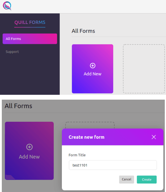 Creará una opción dedicada”Quill Forms”en la barra lateral que puede utilizar para crear y administrar sus formularios. Entonces, solo ingrese a esta sección y cree su primer formulario. Inicialmente, comienza dando un nombre a su formulario.