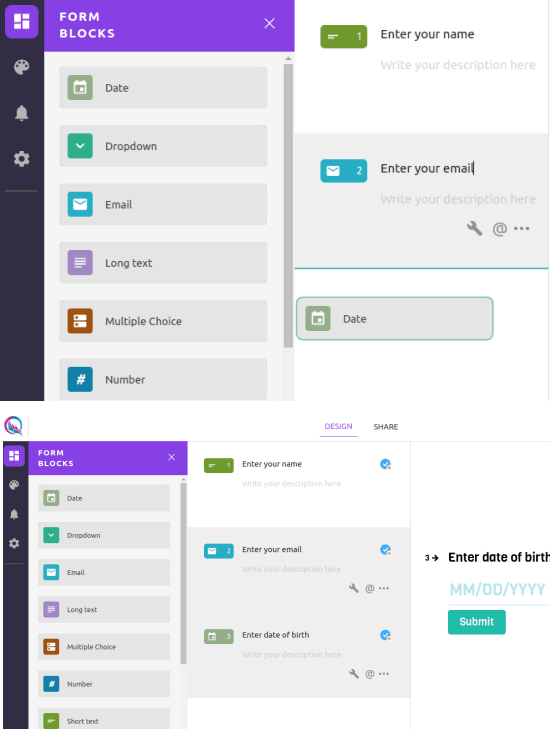 A continuación, pasa al generador de formularios. Aquí puede crear y configurar pasos para el formulario. Cada campo de formulario será un bloque en el formulario de varios pasos que está creando. Simplemente arrastre un campo y suéltelo en el generador. Puede comenzar agregando una pantalla de bienvenida. Después de eso, seleccione qué tipo de campos desea en el siguiente paso y colóquelo allí en consecuencia. Además, puede configurar un texto personalizado para los campos y generará su vista previa en tiempo real.
