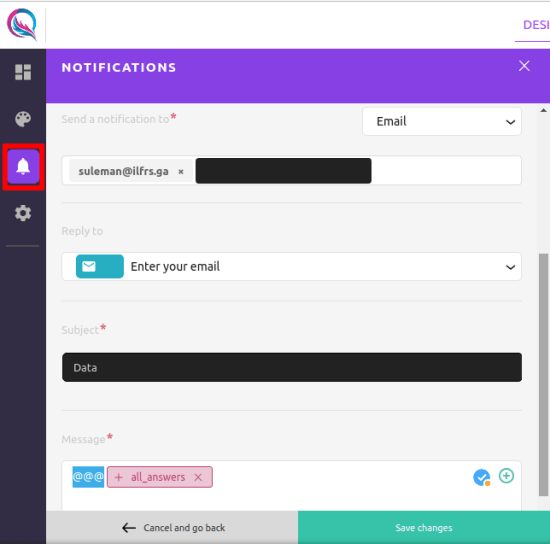 A continuación, configure dónde desea recibir los datos del formulario enviado. Ve a la sección de Notificación y aquí configuras el correo de destino donde quieres recibir los datos. Especifique el asunto del correo electrónico y también elija si desea recibir los datos de campos específicos del formulario o de todos ellos.