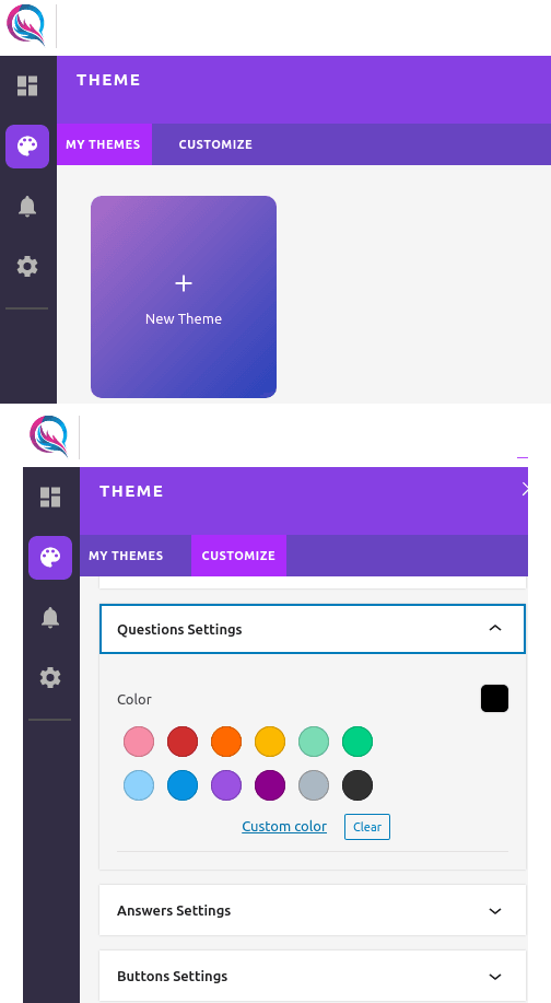 Si desea personalizar el color de las preguntas y los botones, puede hacerlo aquí. Puede crear temas con diferentes perfiles de color y luego aplicarlos en cualquier formulario. Para eso, vaya a la sección Temas en el generador de formularios y especifique colores para los diferentes elementos del formulario de varios pasos.
