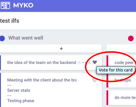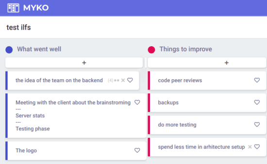 Myko es una ágil herramienta retrospectiva en línea que puede utilizar para recopilar comentarios sobre sprints recientes . Aquí, tus compañeros de equipo pueden dejar reseñas anónimas para que puedas analizar qué cosas deben mejorarse. Además, sus compañeros de equipo pueden votar por las reseñas publicadas en el tablero. Ese proceso es realmente simple y solo tienes que crear un tablero con diferentes columnas e invitar a tu equipo. En el tablero, también puede agrupar opiniones similares en una sola tarjeta. Junto con eso, también puede especificar el máximo de votos que alguien puede emitir.