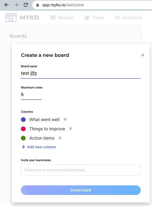 Si necesitas una herramienta retrospectiva para tu equipo, puedes usar Myko. Realmente me gustó su simplicidad y funcionalidad sencilla. Solo tienes que invitar a tu equipo y listo. No existen tantas herramientas como esta. También me gustó el tablero basado en tarjetas que crea para usted y, de hecho, puede editar las columnas en cualquier momento.