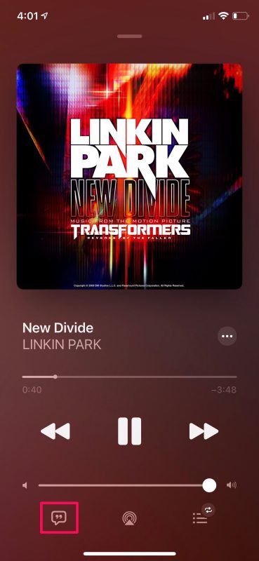 Inicie la aplicación Stock Music y comience a reproducir la canción que desea compartir. Ingrese al menú de reproducción y toque el ícono de letras ubicado justo debajo del control deslizante de volumen.