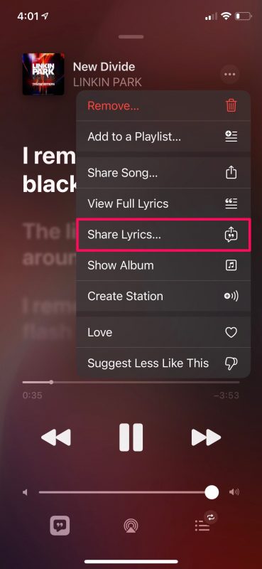 Elija”Compartir letras”en el menú contextual para continuar. Puede acceder a estas opciones incluso si no comienza a reproducir la canción o no ingresa al modo de letras en vivo. Todo lo que necesitas hacer es tocar el ícono de tres puntos junto al nombre de la canción.