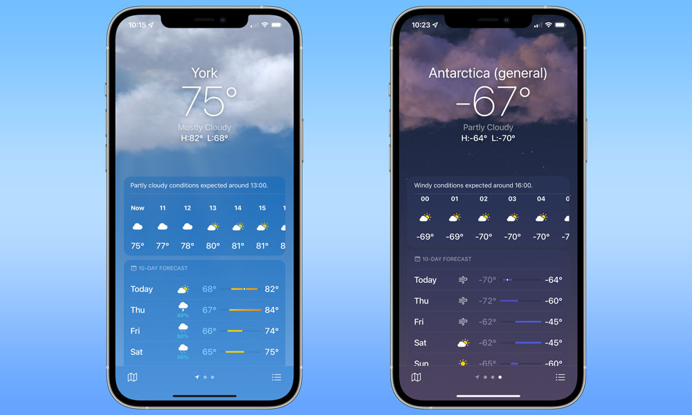 En los casos en los que se muestran medidas como 69 ° F, 65 ° F y 71 ° F, es probable que Apple esté extrayendo los datos de fuentes que los proporcionan en Fahrenheit, o, incluso más probable , fuentes que proporcionan un mayor grado de precisión decimal. Por ejemplo, 20.5 ° C equivale a casi 69 ° F (68.9 ° F, para ser precisos).