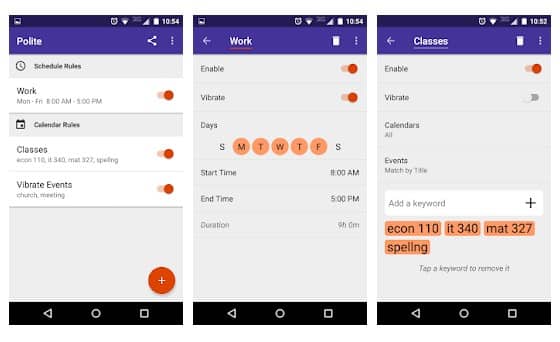 Lo mejor de Polite es que permite a los usuarios elegir horas y fechas específicas para ingresar al modo silencioso, y tiene la capacidad de sincronizar con la aplicación de calendario nativa para aplicar reglas. Por ejemplo, también puede hacer que su teléfono entre en modo silencioso durante los eventos del calendario.