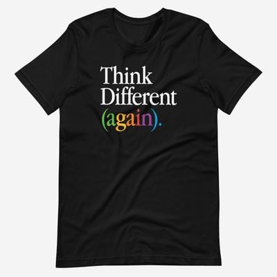 La 9:41 camiseta , por ejemplo, muestra la hora exacta en que Steve Jobs dio a conocer el iPhone original, y el ahora-El tiempo icónico también se utiliza con regularidad en el marketing y las capturas de pantalla de Apple. Un par de camisetas” Think Different (again) “el famoso fraseo con colores del arco iris.
